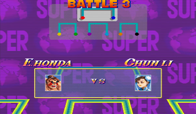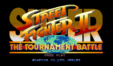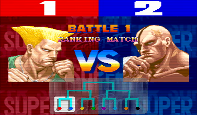 The way it works is that there are four cabinets linked together, so there will be 2 players to each cabinet. The tournament will progress with quarter finals, then semi finals, then the final. The losers in each of these fights would be put into a losers bracket, so the third to eighth places could be decided. There are no new characters or moves, but there is an altered intro sequence and there are also a few new screens showing the tournament chart. The tournament winner's character will appear on a victory screen, that has some new background art -these would later be reused in Hyper Street Fighter II. After each match is played, players may have to get up and move to a different cabinet for their next game. This is why there are so many different colors for each character -in The Tournament Battle, players would keep track of their character by remembering which color they had chosen. This was also necessary if multiple people had chosen the same character, as it is possible, if unlikely, for all 8 players to choose then same character. |