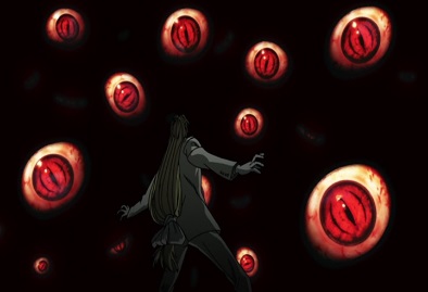 Luke finds himself surrounded by eyes, which all stare at him. Alucard has changed his form, and he tells him that it's time he showed him how a real vampire does battle. Changing into a dog, Alucard lunges at Luke. |