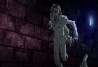 But these ghouls are former Hellsing soldiers. Jan wants to get the party started, and leaps over Walter. He runs towards the conference room, so Walter uses his wires to try and stop him. |