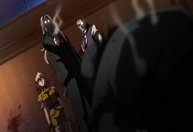 The Round Table members start firing, and Jan gets shot until he falls. Integra then notices what has happened to her men. |