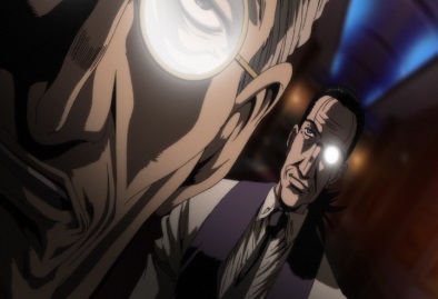 Elsewhere Jan leads his forces towards the conference room. He starts saying all the terrible things he wants to do with Integra, but then Walter appears. Suddenly the end of Jan's cigar is sliced off. |
