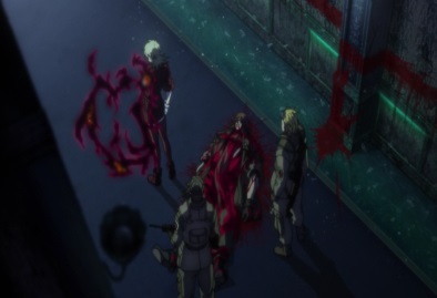 Vernedead picks Seras up, and takes her back towards the conference room. But as he does, one of the shot Nazis gets back up, and shoots Vernedead. |