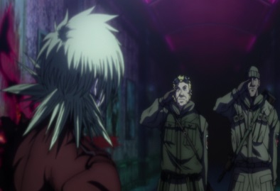The two soldiers see that whilst their captain has died, he still lives on inside Seras. The two of them then salute Seras, and thank her and their captain. She smiles... |