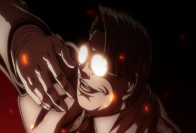 One of the men says killing the woman was just for fun. Seras runs out, picking up a fork. Before either of the two men can stop her, she stabs the fork into one of the men's eyes. |