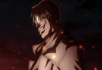 Vernedead still has the strength to keep going, but then falls when Zorin strikes him in the back with her scythe. He drops Seras, and falls down next to a wall. Seras asks what happened. He says she came in here to save him, now he has to save her. He lights up a cigarette. |