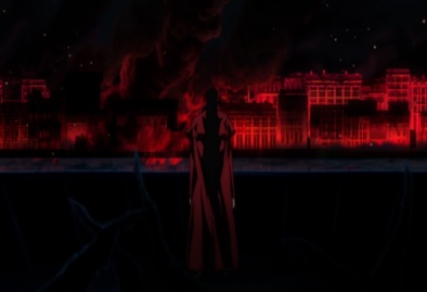 Before the Nazi can fire, he has his head blown apart. The other Nazis turn around too late, as they also get cut up by bullets. Only Zorin survives, and she sees that Seras has arrived. |