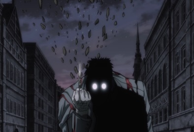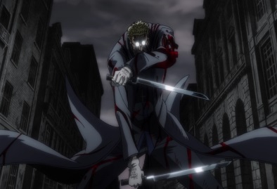 Alucard jumps off the ship and into the city, landing in the middle of a group of Vatican soldiers. Seconds later, Anderson appears... |