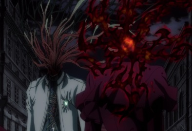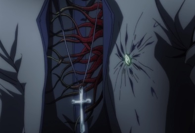 As Alucard reforms, he sees what the relic has done to Anderson. His body is covered in thorns, as Alucard says that Anderson's body is no longer that of a man. Only by gouging out each other's hearts can either of them die now. |