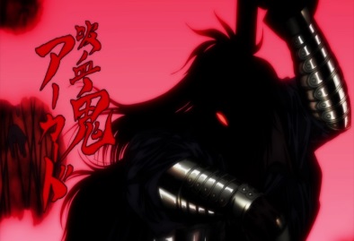 Alucard tells him he's injured, and his arm is hanging by a few strands of meat. What is he going to do -will he die like a dog, or on his feet like a man? |