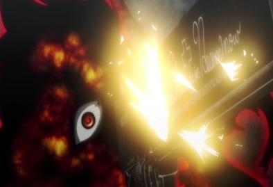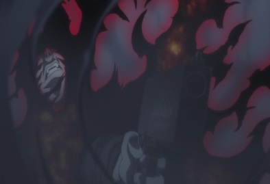 Back in the real world, Seras is screaming out for her master, and attempts to stop Anderson herself. She grabs onto his bayonet and tries to pull it out, but the vines around it start to wrap around her, and catch fire. |