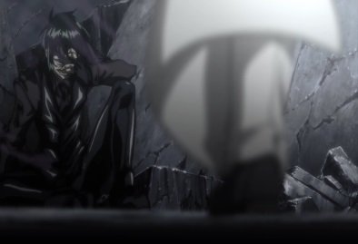 Meanwhile Walter tells Alucard to get up and fight him, but Alucard just laughs at him. He reminds Walter he once told him that Englishmen look forward to growing old, and considers his new form wretched and ugly. He calls him a dark reaper to the very core. Walter says this world is a violent, fleeting dream, and as the dawn breaks, he shall be ready to reap the Earth. He tells Alucard to stand and face him. Alucard says he knows well that the two of them are dogs, and don't bark unless they're told. |