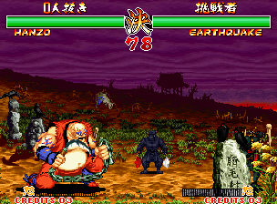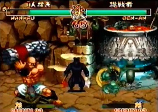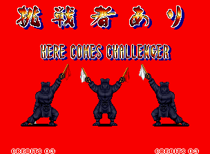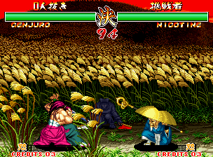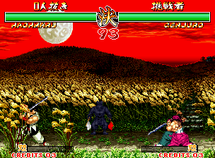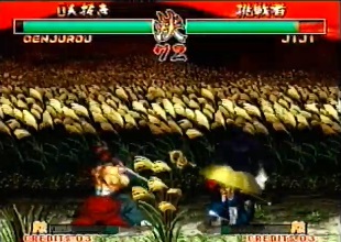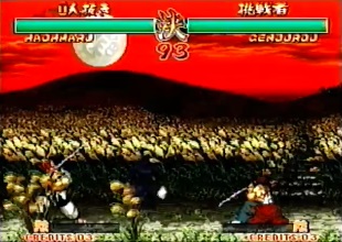 | "Genjurou" was shortened to just "Genjuro" in the final game. Also of note is that in the video, Kuroko hold his red flag in his right hand, and his white flag in his left hand. The flags were swapped around in the final game. As was also seen in the intro, Genjuro's palette is red in places in the video, the red parts were changed to pink for the final game. |