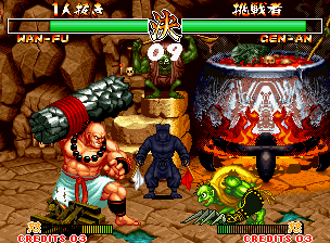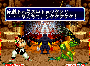 | In the video, the text box is missing for Gen-An's dialogue here. Oddly, there are some words written in Spanish that appear as well: "DUELO TERMINAR?" which means duel end. These words don't appear in the final version, even if the game's text is changed to Spanish in the options menu. | |