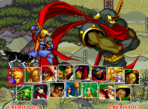 | The character select screen appears to work slightly differently in the video than it does in the final. When P1 joins in, P2's character art is missing. Another difference is that the video never shows the character's sprites at the select screen, only their portraits. In the final version, it only shows the portraits once the character is selected. | |