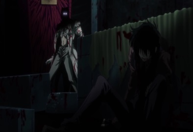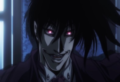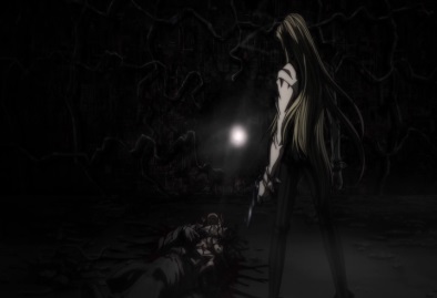 Alucard laughs and says that was such a violent welcome, he feels honored. He explains that killing one's self takes some time, and is his situation, there was a lot of self to kill. 3,425,867 souls were within him, clouding his mind and denying him awareness. He butchered them all until only himself remained. He has returned here, but he is also always nowhere. It's a conundrum, but the truth of it is, he is everywhere. Integra asks him if he was going to drink her blood. He explains he hasn't eaten in 30 years, so he's famished. Integra says the young women he knew is gone, she's now ancient. Alucard reminds her that he's old too. Integra smiles and then bites into her finger, causing it to bleed. As blood trickles down, she tells her dear count that he is home. He tells his countess that he's back forevermore, and prepares to drink the blood dripping from Integra's finger. |