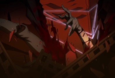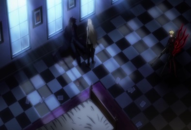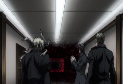Integra finds the Major and tries to kill him, but he's protected by a sheet of bullet proof glass. He explains to her that the main event is one night only: when the curtain falls, Alucard will cease to exist! Outside, Schrödinger takes out a knife and cuts his own head off. His head and body fall into the river of blood. Alucard ends up consuming him, which is what the Major had been waiting for. The Major tells Integra that by drinking Schrödinger's blood, Alucard has become the paradoxical cat. He is now shackled by infinite possibility, and as long as he is self aware, he is everywhere, and nowhere. But that conundrum is now multiplied by the millions of lives and consciousness within Alucard. Alucard is no longer capable of recognizing himself, which means he's not alive, dead or even undead. Integra can only watch as Alucard completely vanishes. |