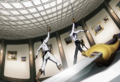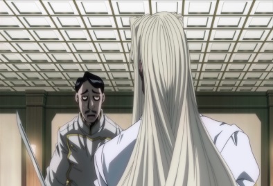 Inside the Major's zeppelin, Seras and Integra slay many Nazis. They come across the Captain waiting ahead, so Seras tells Integra to confront the Major, whilst she fights the Captain. Outside, Alucard starts to gather up all the blood of the fallen in London, so he can consume it. The Major sees what Alucard is doing, and has been waiting for this moment. |