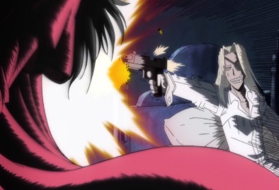The Major and Integra shoot at each other. The Major finally manages to hit something, and shoots out one of Integra's eyes. But she shoots him in the head, killing him. Integra tells him that nobody will think of this as a war, this was just an exchange of bullets -the death rattle of a sad lunatic half a century past his prime. As the zeppelin starts to explode, she and Seras leave. Elsewhere, Doc attempts to gather up some of his research so he can flee and continue his experiments, only for Walter to find him. |