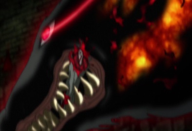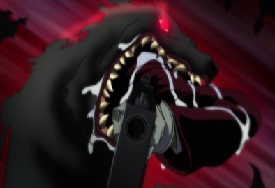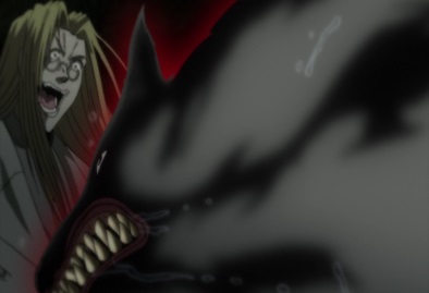 Luke tells him to shut up, he's just the Hellsing family toy, a dog for the church of England. Alucard says that if he's a dog, then it must make Luke dog food. Changing his form again, Alucard lunges towards Luke and consumes him. |