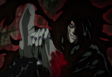 Van Helsing raises his fist, then strikes down onto the stake, making Alucard bleed heavily and fly back. Van Helsing tells Alucard he has nothing, and he is nothing. |