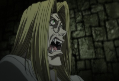 This shuts Seras up for the moment, as Walter reminds her that as she is refusing to drink blood at the moment like a proper vampire, she will slowly become weaker. She must now sleep in a coffin filled with the soil of her birth place, as this is the only way she can keep up her strength. Is she still feeling uncomfortable with the situation? Seras says she is, just as Alucard walks in and calls her an idiot. He reminds her that she chose the night, and once she turned her back on the light of day, all the sunlight should mean to her is smoldering pain and a slow death. |