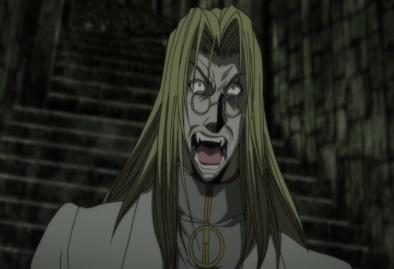 With him out of the way, Alucard says he regrets overestimating him. As a vampire he was nothing but a pathetic piece of shit, now he's nothing but dog shit. He can sense the other vampire upstairs didn't seem like much, but it appears they're having more trouble with him than he would of expected. Back upstairs, the ghouls begin to attack, and one of them manages to make Seras fall over. |
