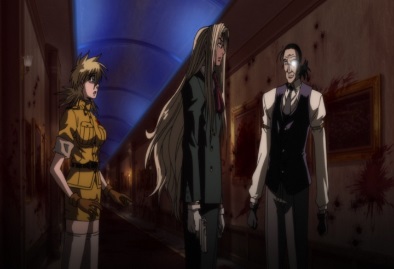 Integra sees what has happened to her men, and what Seras is doing. She rushes over and tells Seras that's enough, and she can stop. Seras snaps out of in and calms down. Walter kicks Jan into a wall, and tells him it's all over. He wants to know who put him up to this, then he'll put him out of his misery. Jan calls him a pussy. |
