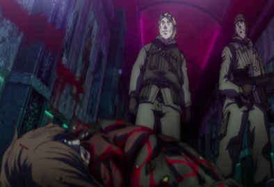 Vernedead picks Seras up, and takes her back towards the conference room. But as he does, one of the shot Nazis gets back up, and shoots Vernedead. |