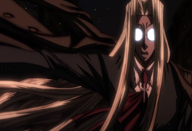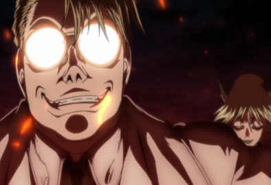 Seras says that Zorin called Vernedead a gnat, so she will pay. She screams that Zorin will pay, and then bites down onto Vernedead's neck. She starts sucking his blood. |