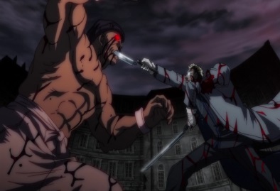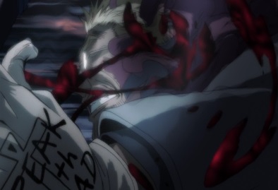 Alucard starts shooting. Both Alucard and Anderson can now heal wounds instantly, and Anderson's thorns are capable of countering Alucard's shadow matter. |