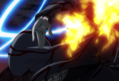 He throws out several bayonets, which are linked together by chains. These all explode, as Anderson continues to run forward. He says he wants more. |