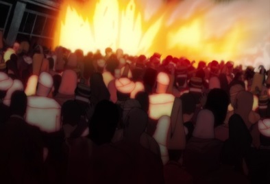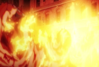 The thorns entangle Alucard, and then catch fire. His army of familiars also catches fire, and soon everything is ablaze, including Alucard himself. |