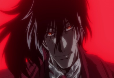 ...on Alucard, who has become red and black shadow matter. As Anderson leaps up, he says it's as if everyone here can feel it coming -something terrible is about to happen, and if they can't all put this monster down, they may all be doomed. Alucard says "to keep myself tame" as his coffin fully opens. Several playing cards fly out of the shadow matter... |