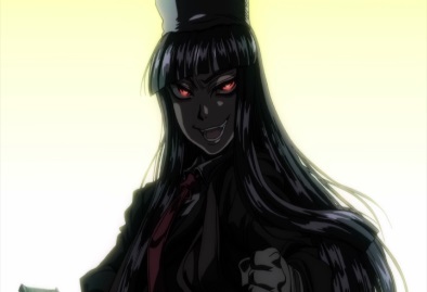 ...and pats her on the head. He calls her by her real name, and is clearly proud of what she has become. Anderson then drops down and clashes with Alucard. |