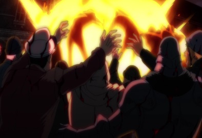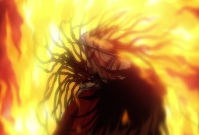 Anderson then leaps up, and throws a bayonet through Alucard's head whilst he's still taking aim. Thorns erupt from the bayonet which entangle Alucard and catch fire. Alucard's army of familiars also catches fire, and soon everything is ablaze, including Alucard himself. |