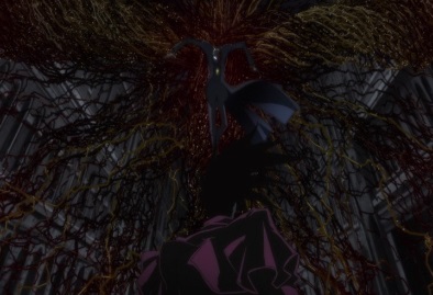 Anderson makes it to where Alucard is, and reveals his secret weapon: the Nail of Helena. Despite Alucard telling him not to, not wanting him to become a monster, Anderson stabs himself with it. His injuries heal and thorns erupt from his body, as his fight with Alucard resumes. As both of them can heal their injuries instantly now, Alucard says the only way one of them could win is to gouge out the other's heart. Alucard tries to shoot Anderson's heart, but some thorns block the bullet. |