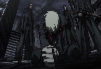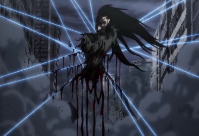 Walter wraps a wire around one of Alucard's legs, and then smashes him into some buildings. Walter reminds Alucard that he once told him that true immortals don't exist, and he thinks now that he was onto something -so he'll put it to the test. He'll keep killing him until he stays down. |