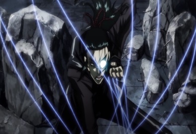 She moves so quickly she becomes a streak of blue light, which passes by Walter. She then reappears behind him, having used her Shimbara quick draw attack, and tells Walter he's dead. But he tells her that she's the one who's dead. |