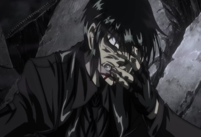 All that's left of Anderson is part of his upper body. Alucard tells him that he and him are the same. Alucard starts to cry, saying this is how he became what he is. However, Anderson surprises everyone by starting to laugh. He tells Alucard that demons don't cry, so are these the tears of a long dead child? |