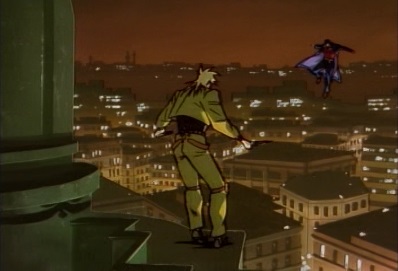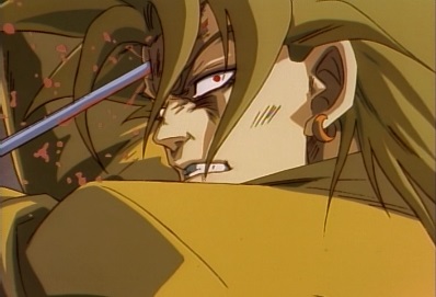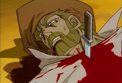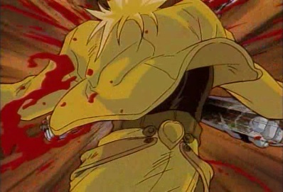 As he approaches Jotaro, he's unaware that there is someone above him. Dio says this is the end, and goes to strike Jotaro. But as he does, a rapier suddenly gets shoved through his head! |