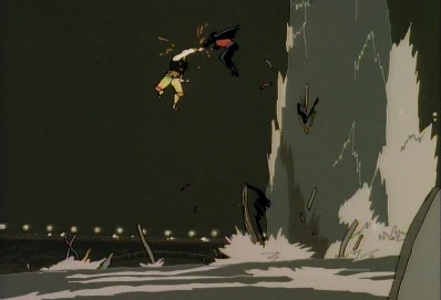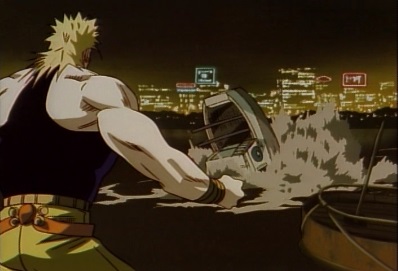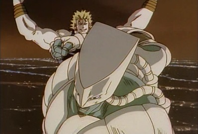 Dio kicks Jotaro a couple of times, and Jotaro hits the sea. Dio picks up a boat, and throws it at him. |