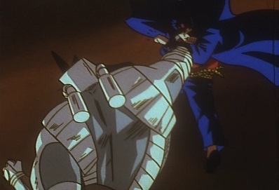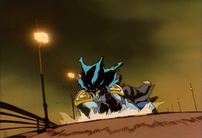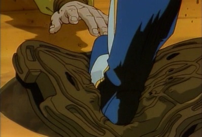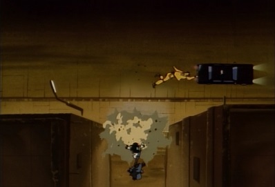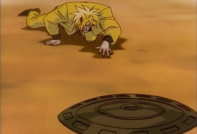 The car drags Dio away, as Dio hopes he can make it to that place. Jotaro has some knives hit the car, causing the bumper bar to fall off. Dio rolls down the road, but then sees a manhole. He crawls towards it... |