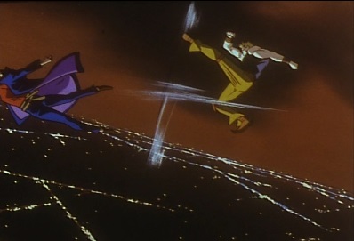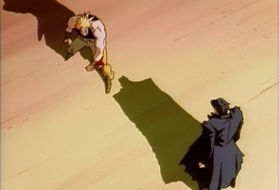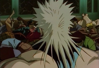 Jotaro charges forward, thinking nobody could stay unaffected after seeing something like that, and thinks Dio has now made him incredibly angry. Dio says this is the final round. Jotaro leaps up into the air. |