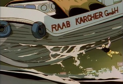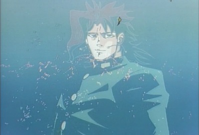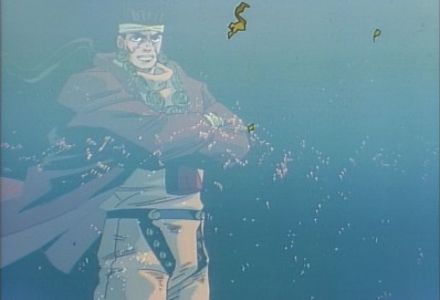 As he watches the boat sink, Jotaro thinks this still isn't enough... he's not nearly enough angry yet! He leaps out of the water. |