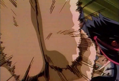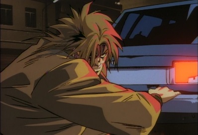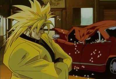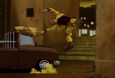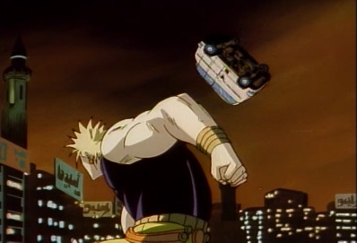 Dio suddenly stops time, and flips over backwards. Star Platinum's attack misses, and Dio grabs onto the back bumper of a car. Time then resumes. |