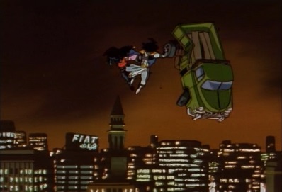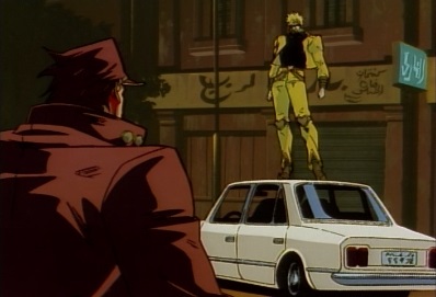 Dio lands in a parking lot, and throws a couple of vehicles at Jotaro. Jotaro avoids one and hits the other aside, and then lands on a building. Dio jumps towards him, saying that this surge of power feels great! |