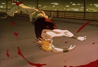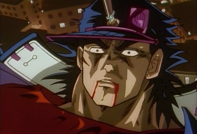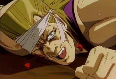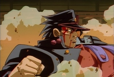 He squirts blood from his leg, which hits Jotaro's eyes. He goes for a kick... |