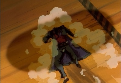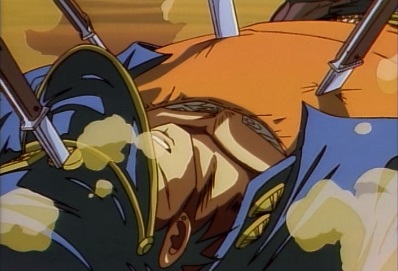 Dio thinks this can't be, he can't... before he can say any more, his body explodes. Jotaro tells him there was only one cause for his defeat: he made him angry. |