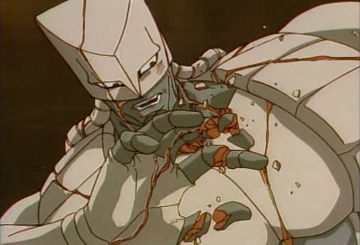Star Platinum's hand cracks. But after a few seconds, the World's leg cracks, as does the rest of his body. |