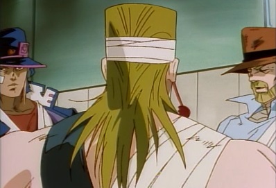 Time resumes, and Jotaro says he at last managed to deliver a direct blow to Dio's head. Polnareff says he made it in time, and asks Jotaro if he finished Dio off. Jotaro asks him about his injuries, but Polnareff tells him to not mind that. He tells him to get Dio, and avenge Avdol and Iggy! Jotaro realizes that Iggy has also died. Polnareff says he can't move any more, but Jotaro tells him not to talk, and to just wait here. |